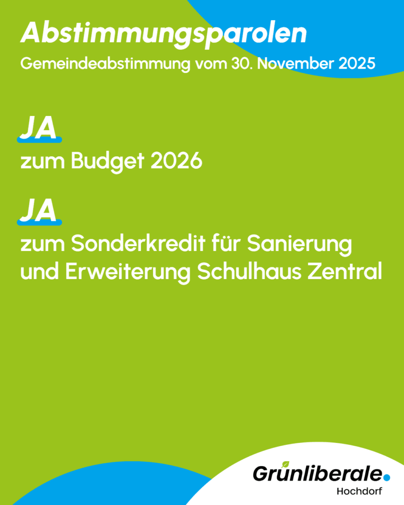 Am 30. November stimmen wir über das Budget 2026 und den Sonderkredit Schulhaus Zentral ab. Die GLP Hochdorf sagt zwei Mal Ja – für nachhaltige Finanzen, moderne Bildung und eine zukunftsorientierte Gemeindeentwicklung.