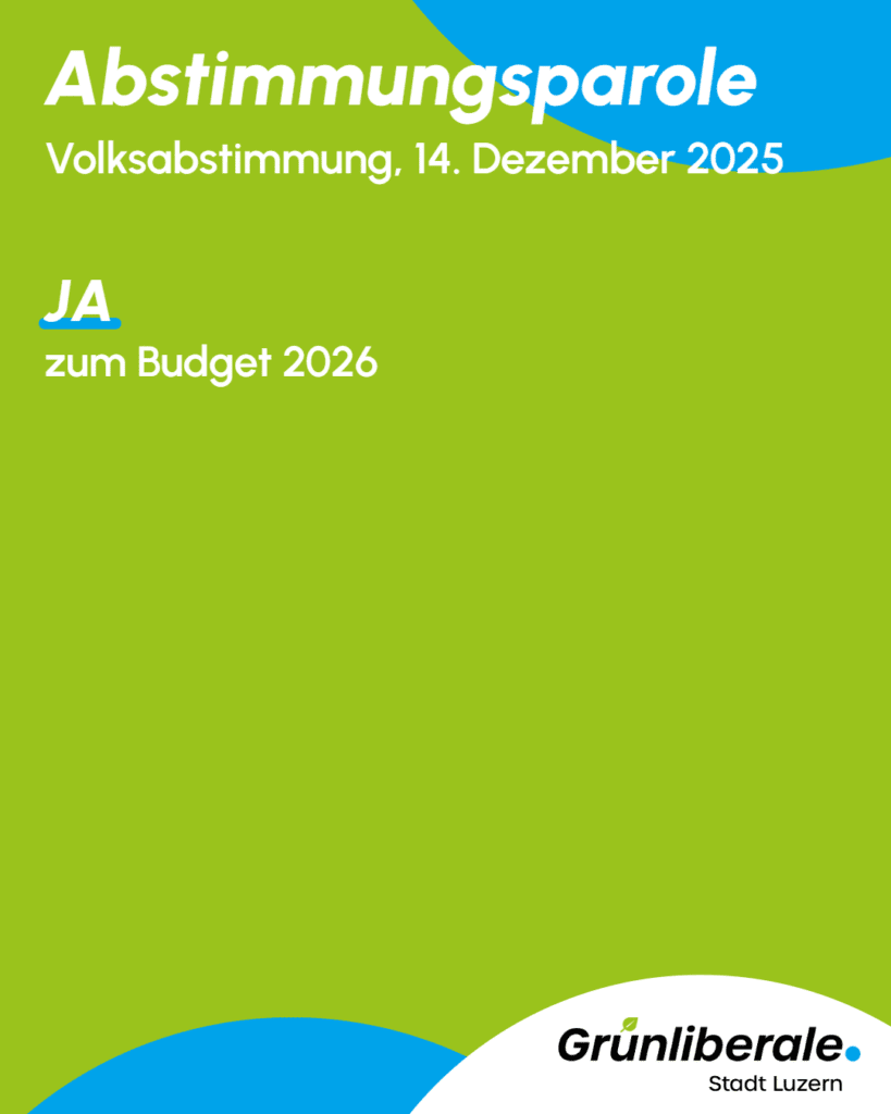 GLP Stadt Luzern sagt JA zum Budget 2026 – für Stabilität und Verantwortung Die Grünliberale Partei (GLP) der Stadt Luzern fasste an ihrer Mitgliederversammlung am Montagabend, den 10.11.2025, die JA-Parole zum Budget 2026 der Stadt Luzern. Die GLP unterstützt das Budget als ausgewogenen Kompromiss zwischen finanzieller Verantwortung und zukunftsorientierten Investitionen. Die GLP ist überzeugt, dass […]