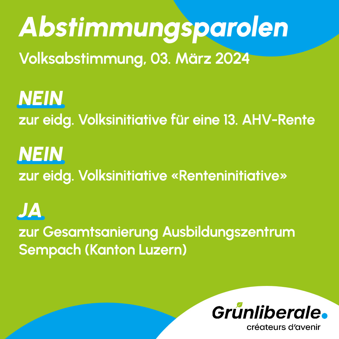 An ihrer Mitgliederversammlung vom 17. Januar 2024 hat die GLP Luzern ihre Parolen für die Abstimmung vom 3. März gefasst. Die GLP Luzern empfiehlt mit deutlichen 88 % Nein-Stimmen (0 % ja, 12 % Enthaltungen), die Volksinitiative «Für ein besseres Leben im Alter» (Initiative für eine 13. AHV-Rente) abzulehnen. Ebenfalls erhält die Initiative «Für eine sichere und nachhaltige Altersvorsorge (Renteninitiative) mit 56 % negativen Stimmen die Nein-Parole der GLP (26 % ja, 18 % Enthaltungen). Hingegen wird der kantonalen Vorlage zur Gesamtsanierung des Ausbildungszentrums Sempach mit lediglich einer Enthaltung zugestimmt.